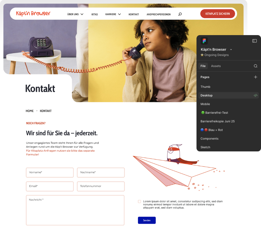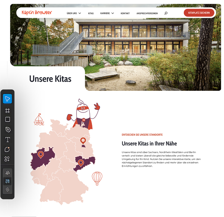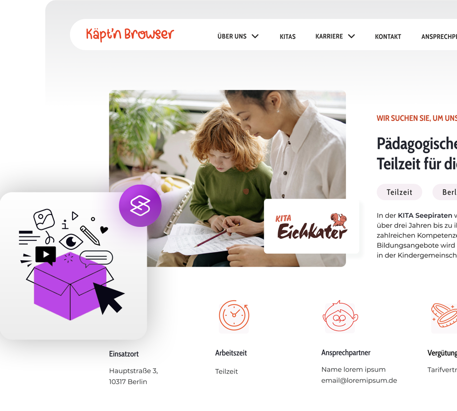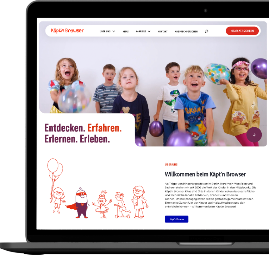 Jede der 22 Einrichtungen hat eine eigene Landingpage aka Bühne – mit individuellen Informationen, pädagogischen Schwerpunkten, Ansprechpartner:innen und authentischen Einblicken in den Kita-Alltag. So entsteht ein lebendiges Gesamtbild, das die Vielfalt und Stärke von Käpt’n Browser als Träger sichtbar macht. Ein zentrales Kitaplatz-Formular erleichtert Eltern zudem die Kontaktaufnahme und Anfrage.